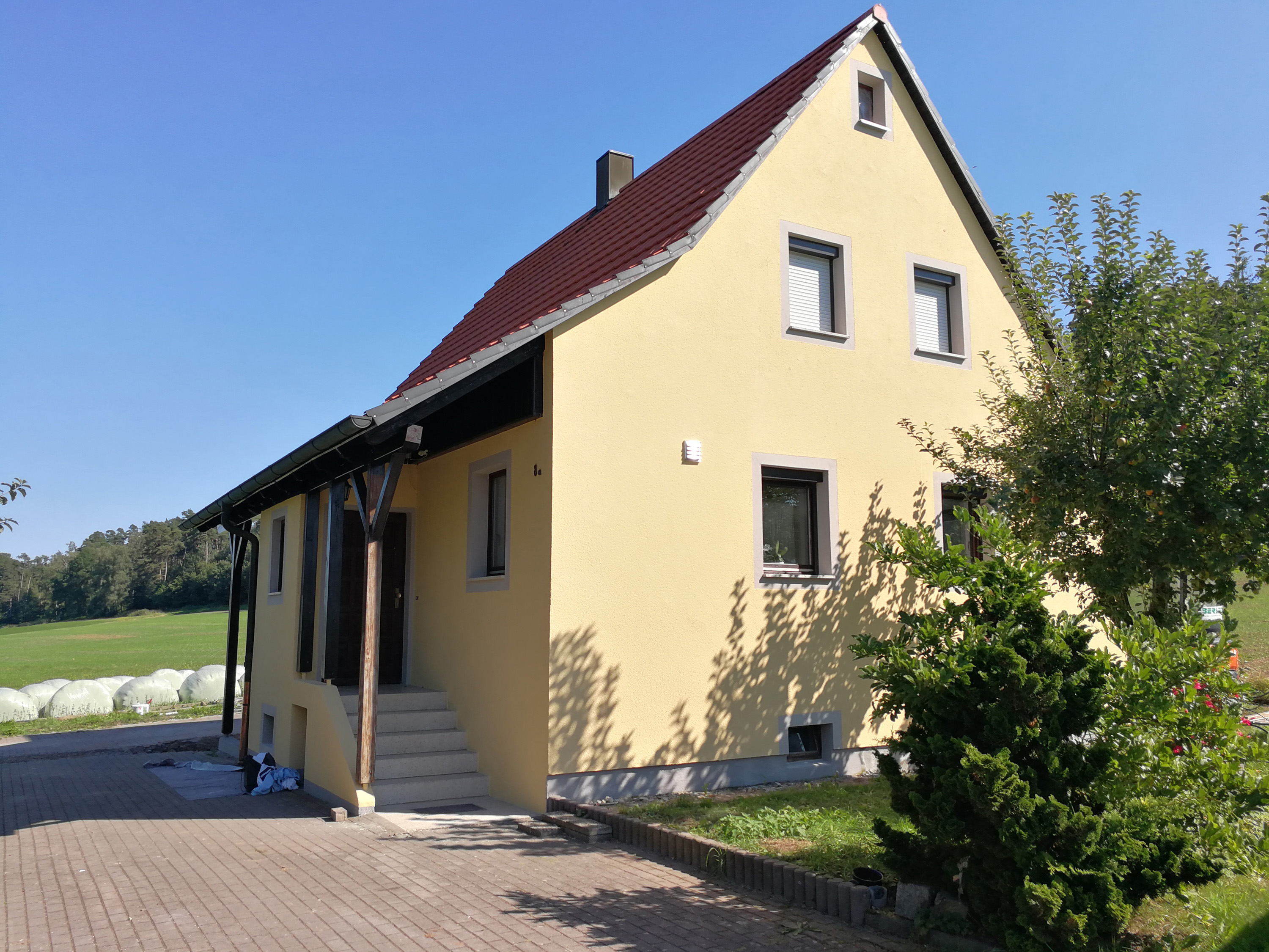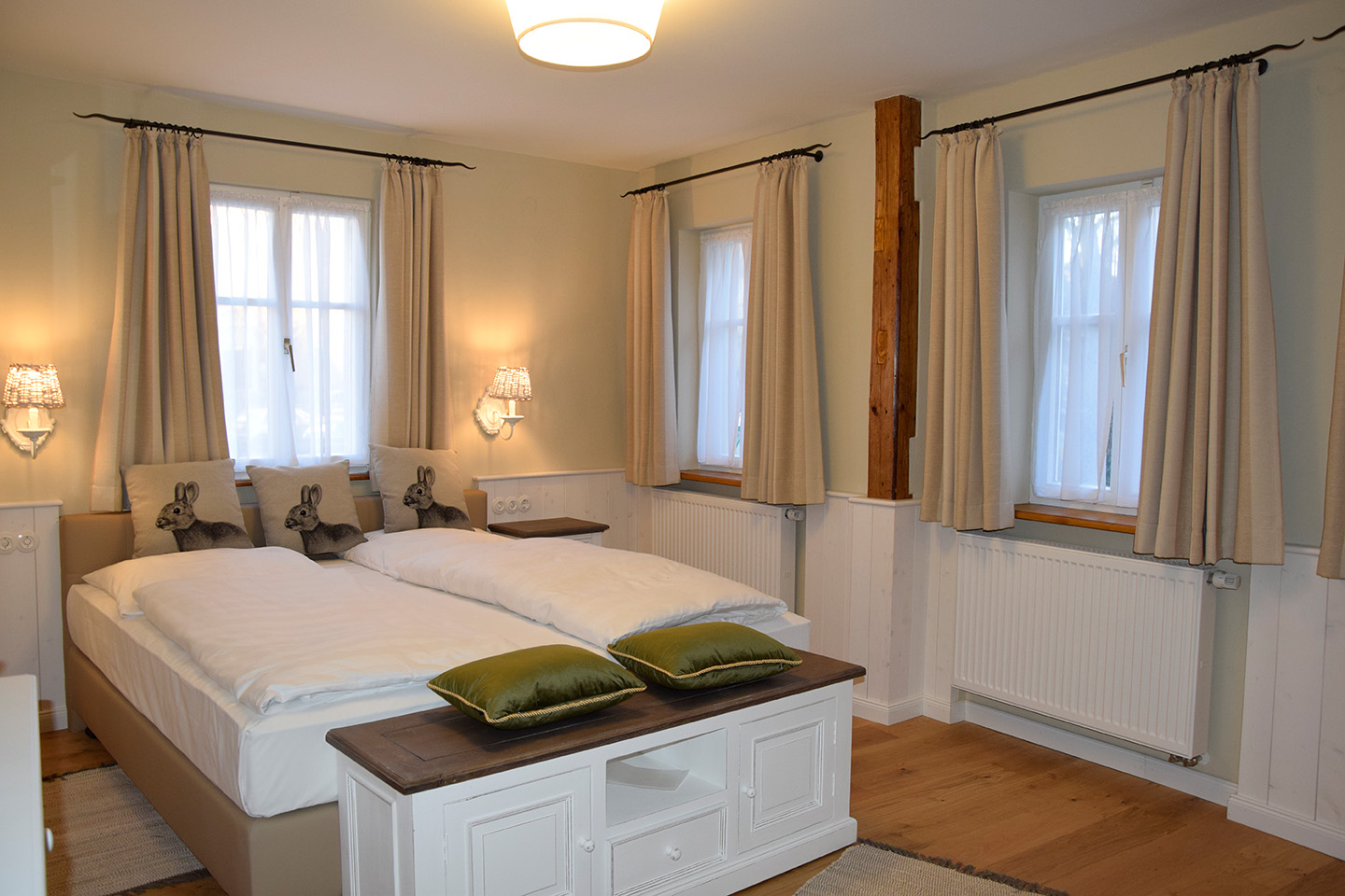 Reichsküchenmeister Ferienwohnungen: Decke, Schrägen und Wände gespachtelt, geschliffen, mit Streichputz grundiert und gestrichen, Fenster weiß lackiert, Holzbalken mit Wachslasur gestrichen