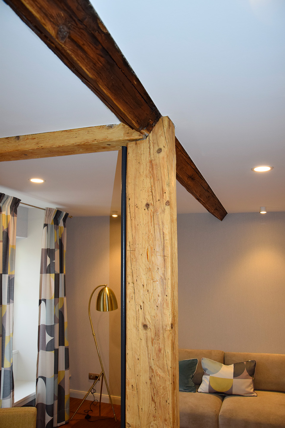 Hotel Markusturm: Decke mit Glasvlies beklebt und gestrichen, Wände mit Kalkputz verputzt und gestrichen, alte Fachwerksteine gereinigt und farblos versiegelt, Holz mit Wachslasur gestrichen